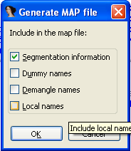 - MAP: files that contain information about symbol names from the executable. When creating the MAP file, we'll be able to choose which symbol names to include in it. A dialog box like the one presented on the picture below will be shown, asking us what we would like to include in the MAP file: