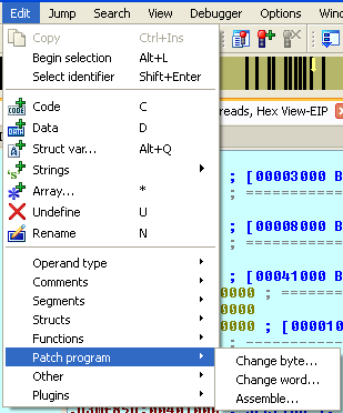 On the picture above we can see three options: Change byte, Change word and Assemble, which can be used to change the database that Ida uses for representing the binary executable. With these options, we won't actually change the binary executable itself, but only the database representation of the executable that Ida uses for reversing. We can use the options presented above to change the Ida database, which we can later use to create a new patched binary executable.