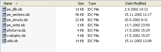 If we want to patch a program in Ida easily, we can download pe_scripts.zip from http://www.openrce.org/downloads/details/57/PE_Scripts and extract it. The zip archive contains the files presented on the picture below: