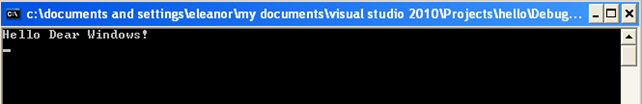 We can see that the program is really simple; all it does is print the "Hello Dear Windows!" string on the screen and then wait for the user to input a key. This is done for the sole reason that we won't have to set breakpoints at the end of the program, because the program execution is stopped while waiting for an input from the user. Once we compile and run the program, we'll be presented with a new window that can be seen on the picture below: