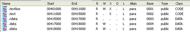 After the executable has been loaded, we need to run the pe_sections.idc script to translate all sections from the executable file into Ida's database. We can run the file by selecting it in the File – Script file dialog. Before the script is run, we'll have the segments presented on the picture below loaded into the Ida database:
