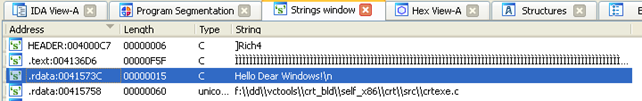 We can see that a few segments have been loaded into Ida's database. Now it's time to change the bytes in Ida's database. In our case, we'll change the string "Hello Dear Windows!" into "Hello Dear Linux!" We can quickly locate the string by opening the Strings window, which is presented on the picture below: