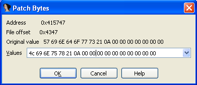 The bytes 4c696e7578210a are the hexadecimal representation of the string "Linux!n" which we need to input into the Patch Bytes dialog box as shown below: