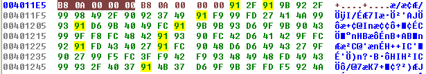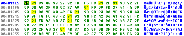 We're currently located at the first byte 0x91 at address 0x004011E5. If we now press on the Edit – Patch program – Patch bytes, a new pop-up window will be displayed presenting the first 16 bytes from the beginning of our cursor, which is located at the address 0x004011E5. In the picture above, we can see that the first 16 bytes are indeed the exact same ones as on the picture below.