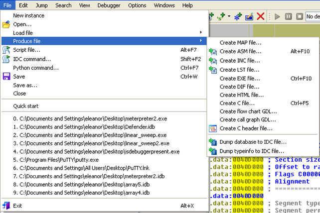 We can see that Ida is capable of creating various file formats, like ASM, EXE, HTML, C, etc. Let's describe what each of the options in the Produce file can be used for. Ida can be used to produce the following file formats: