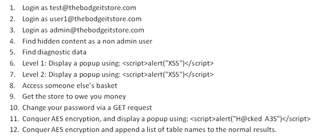 This vulnerable web application also has a scoring page which lists 12 challenges to complete. Reporting of any other vulnerability discovered is welcome.