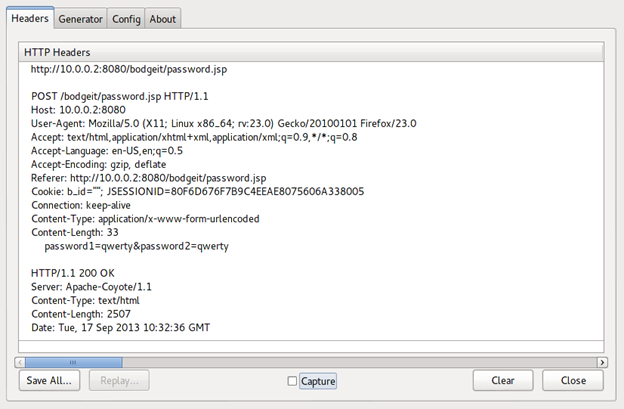 Login with the tester account created previously. The account password can be changed by clicking the email address in the top right hand side (http://10.0.0.2:8080/bodgeit/password.jsp).