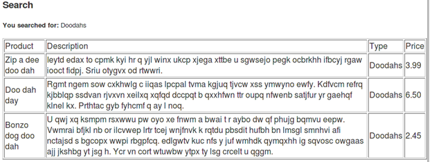 This page has a search form which accepts user input and performs a search operation. Let's test it by entering a product name; the response we receive is: