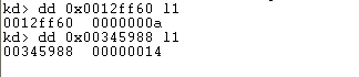 If we try to dump memory from the 0x095c0260 address, we won't receive anything useful (the data at those addresses is not defined). The result of running the "dd 095c0260" command can be seen on the picture below: