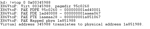 Above, we've walked all the tables that are used to translate the virtual memory into physical memory manually. At the end we've been able to get the actual physical addresses to the corresponding virtual addresses, but we had to do a lot of work to translate one single address. Isn't there a better way of doing this? Of course there is!Windbg provides two commands that can help us with that:the !pte and !vtop commands. To display the whole translation routine, we can execute the "!vtop 0 0x0012ff60" command, where the first argument 0 specifies that we would like to use the currently debugged process's context. The first parameter to !vtop command is the page frame number, which is the same number as DirBase without the trailing three bytes. The second parameter specifies the virtual address to translate into physical address. Before being able to use the !vtop command, we must use the "!process 0 0" command to display the environmental variables – particularly DirBase– of the current process, and then use .process command to set the current index into the process's context switch structure in memory. After that we can use the !vtop command successfully, as can be seen below: