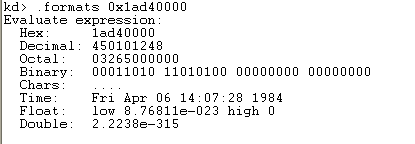 Let's now take our linear addresses and split them into four parts corresponding to the format when PAE is enabled: the first part is an index into the PDPT table, the second part is an index into the page directory table, the third part is the index into the page table, and the fourth part is the last 12-bits of the actual physical address. Let's use the .formats command to display our linear addresses in different representations: