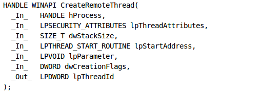 In this tutorial, we'll talk about how to inject a custom DLL into the process's address space by using the CreateRemoteThread function call. The CreateRemoteThread function creates a thread in the virtual address space of an arbitrary process. Let's take a look at the parameters we must pass to the functions, which we can see on the picture below (the picture was taken from [1]):