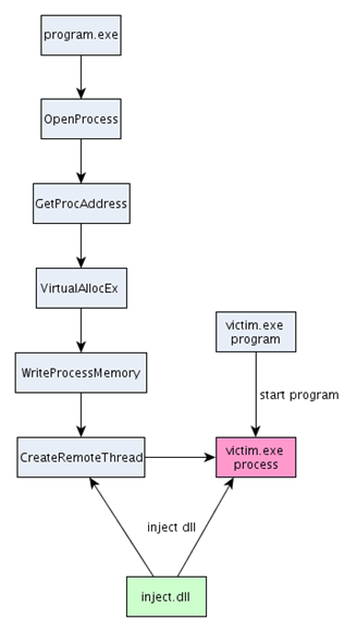 The program.exe must call the presented functions sequentially in order to be able to inject a DLL into the victim's address space. First, it must call OpenProcess to get a handle to the victim's process. Afterwards it must call GetProcAddress function to get the address of the LoadLibraryA function inside the kernel32.dll library; here we can run any function we like, but it must be present in a DLL, which is already loaded in the process's address space. We know that every program uses kernel32.dll library, so the best way to inject a DLL into the process's address space is looking for the LoadLibraryA function and calling that. In order for our DLL to be loaded, we must pass a DLL path to the LoadLibraryA function, but the name needs to be stored somewhere inside the processes address space. Obviously, it's highly unlikely for the path to our DLL to already be present somewhere in the process's address space, which is why we need the next two functions: VirtualAllocEx and WriteProcessMemory. The first function allocates a new memory range inside the process's address space. The size of that memory region needs to be only as large to fit the name of the DLL inside it; usually the size is rounded up to occupy at least one page. The WriteProcessMemory is the function that actually writes the path of our DLL to the victim's address space. At last, the CreateRemoteThread is called that calls the LoadLibraryA function inside the victim's address space to inject a DLL into it.
