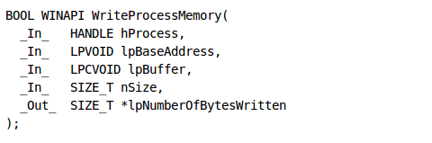 The next function is WriteProcessMemory, which syntax can be seen below [4]:
