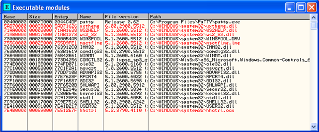 Here we'll see whether our injection program works. First, start OllyDbg and load putty.exe program. Upon starting, the putty.exe will load the modules presented on the picture below: