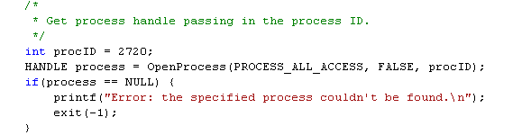 HANDLE process = OpenProcess(PROCESS_ALL_ACCESS, FALSE, procID);