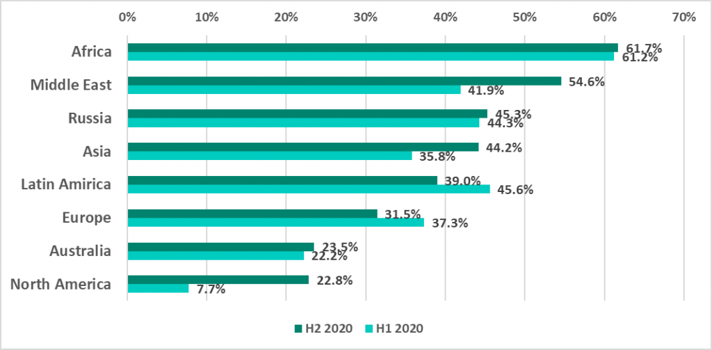 The regions with the highest number infections attempts blocked by Kaspersky security solutions in H2 2020 are Latin America, the Middle East, Asia and North America. On the other end, the number of blocked malware attacks in Africa, Russia and Europe decreased in H2 2020 compared to H1 2020.