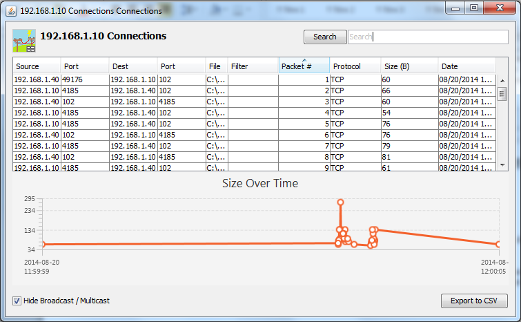 It is also possible to isolate communications linked to a particular device and get a first analysis: packets' size, instant of emission, packets' origin (if more than one PCAP file is used):