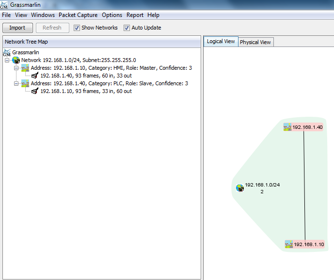 The passive nature of GRASS MARLIN means that the detection method does not generate any traffic on the network. Therefore, this necessitates the need to obtain the results of the logical view by employing a classic packet analyzer. This means also that GRASS MARLIN can only analyze traffic that it is actually able to sniff on the host machine. This implies that one would want to install GRASS MARLIN on the server(s) that is polling the ICS network or obtain the data from the principal router.