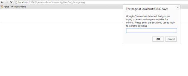 Imagine that along the elements creating the graphic we have a script which checks if the user is running Google Chrome and if he is – it tells the user that the Google Chrome browser has detected that the user is trying to access an image unsuitable for minors and asks the user to provide the credentials with which he logs in to Google Chrome (his Google account). After providing them, the svg redirects the user to a malicious website and sends to it his credentials. The example below is a simplification of a sample real-world scenario:
