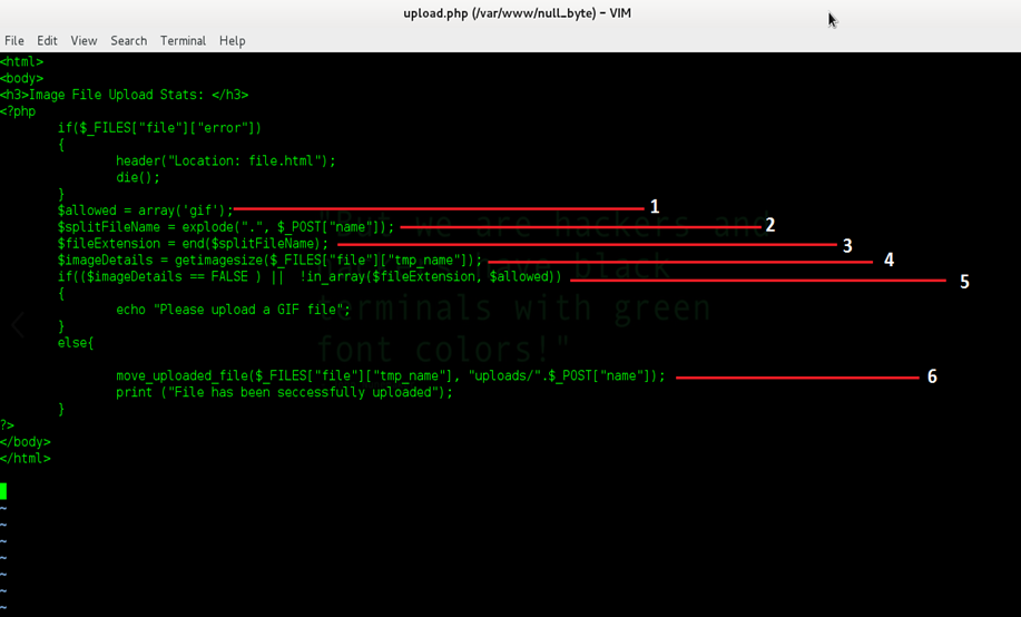 Now, our target is to upload the PHP command shell into the server. As we can see in the source code, there is no code level vulnerability in the PHP code, but it is possible to bypass this code through the null byte injection. Let's do this. The steps are following.