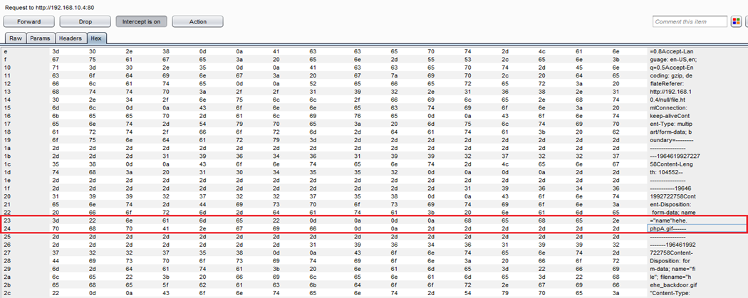 Once we identify the name, we can see the corresponding hex code. We have changed hehe.gif to hehe.phpA.gif in raw data. We can see the same thing in the hex code. Now, add the null character in the position of A. We already know that the value of A in hex ASCII is 41. Now, replace the 41 to 00 to add the null character. 00 denotes a null character in hex ASCII.