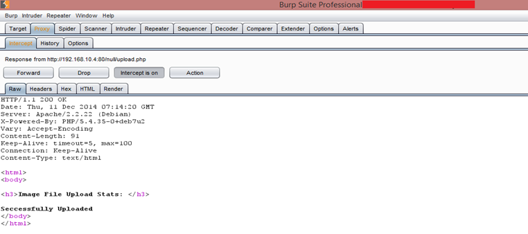 Let's try again. Setup the Burp Suite Proxy with the browser and turn the Burp Intercept on, and then upload the same file again. By clicking on upload, we can see Burp captures the browser request. The request can be seen in the following screenshot.