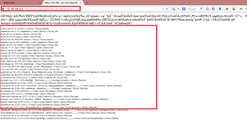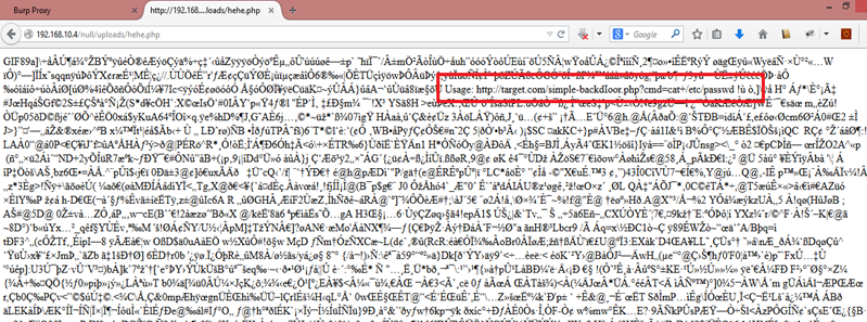 We can see the GIF file image code in the browser. We can also see our backdoor we added in the previous steps has also been executed, because the extension has changed from GIF to PHP.