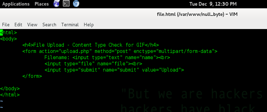 Download any image file with the extension GIF from the Internet and copy it into a folder. We also need a simple PHP backdoor for exploiting the null byte vulnerability. Kali Linux has a large amount of exploits. Let's copy the PHP backdoor into the same directory in which we have the GIF image.