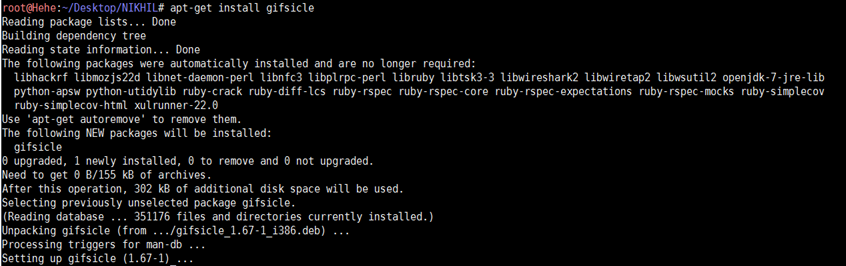 Now, we have to install a package name Gifsicle. This package is not installed in Kali Linux by default. This tool is used to manipulate the GIF file. We can install it by using the following command.