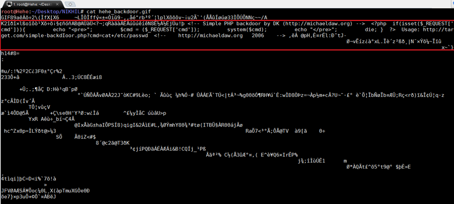 This command will merge the PHP code into the GIF file and create a new file hehe_backdoor.php. This command is used to add PHP code into the GIF file as a comment. Let's check where the PHP code is inserted in the GIF image. We can check it by running the following command.