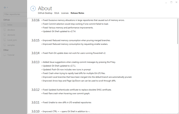If you are using additional client tools like GitHub Desktop, your list must also include those. In the case of GitHub Desktop it is easy to check what has been fixed by either clicking Settings -> About GitHub Desktop -> Release notes in GitHub Desktop window (see Fig. 3) or visiting its website [3].