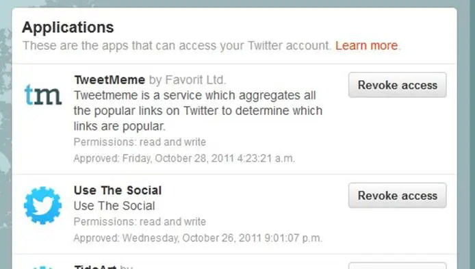 The first thing you should do is make sure the email you associate is also a hidden address, just like for Facebook. Then, go to the Twitter settings on the web site, and check out which apps have access to your account. Twitter, just like Facebook, has a list of apps to which you have granted permission. You should never give your Twitter password to another app or device. You should always make sure they use Twitter's OAuth API, which is what happens when the app opens a small window from Twitter which asks you if you want to grant them permission. That way, the app will appear on this page, and you can revoke access at any time.