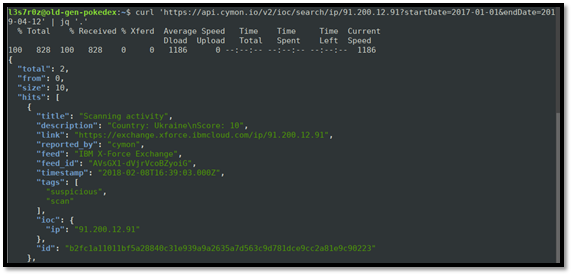Using Cymon’s API, we were able to query for more information from this source. We used the following curl command to achieve our results: