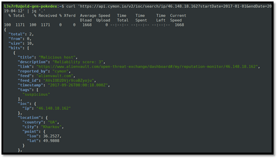curl 'https://api.cymon.io/v2/ioc/search/ip/46.148.18.162?startDate=2017-01-01&endDate=2019-04-12' | jq '.'
