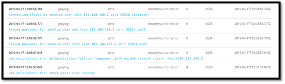 Graylog allowed us to access granular information for each alert logged. For instance, drilling down to one failed SSH log is shown below: