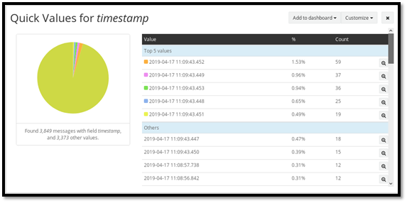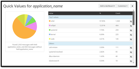 We took a closer look at the rest of the logs by clicking on “application_name” on the left of the web view of Graylog and selecting “Quick values.” That allowed us to view a summary of the logs in a chart view as shown below: