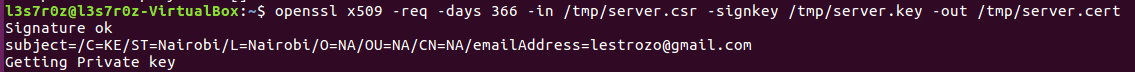 In the step below, we generate a certificate signing request file. The command and output are shown below:
