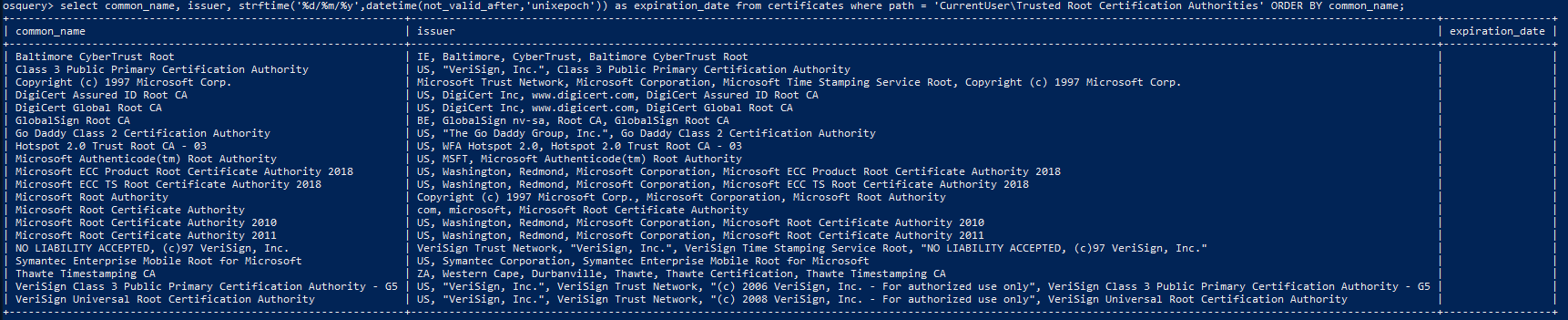 select common_name, issuer, strftime('%d/%m/%y',datetime(not_valid_after,'unixepoch')) as expiration_date from certificates where path = 'CurrentUserTrusted Root Certification Authorities' ORDER BY common_name;