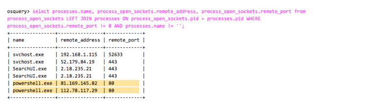 The query above shows the JOIN statement we used between the process_open_socket and processes tables. As can be seen, PowerShell connects to two remote IPs at port 80.