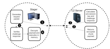 After that, the communication starts. The stager (shellcode) sends a challenge request (1) to the C2 server and waits for a response. When the connection from C2 is received and decrypted, the shellcode checks for magic values of signature bytes at specific offsets to validate if the traffic and post-payloads are legitimate. If the check fails, the connection is immediately aborted.