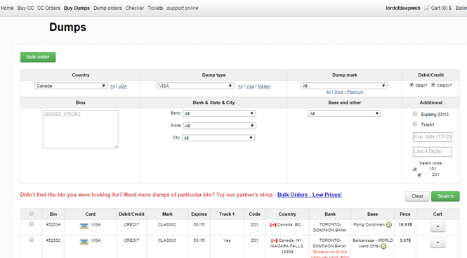 By accessing to the popular online marketplace operated by Rescator, users can easily buy dumps using its friendly interface. Just select a country, the dump type (VISA, MasterCard, AMEX, etc.) and the type of card to retrieve a list of results ready for your bulk order.