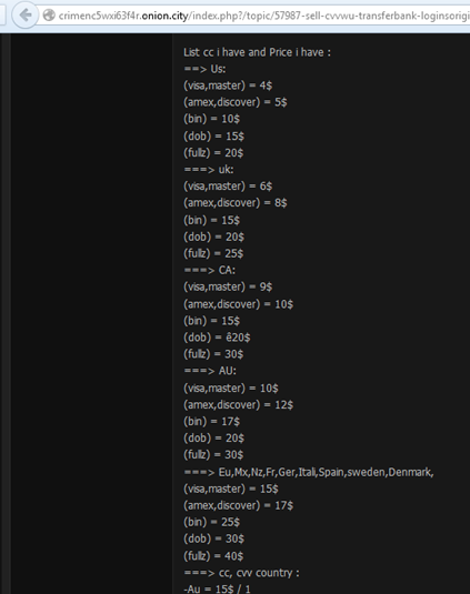 Figure 2 - Stolen card data offered on Tor forum