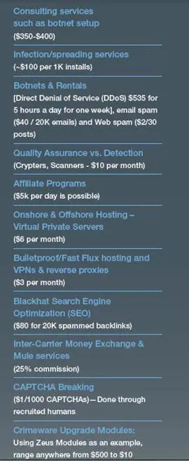 - Crimeware Upgrade Modules: Using Zeus Modules as an example, range anywhere from $500 to $10K
