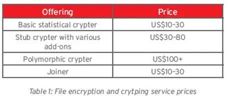 Very popular are file encryption and crypting services for malware creation – essential components to allow a malicious code to avoid detection by defense systems. The most important module for crypting services is the crypter stub used to code/decode a malicious software.