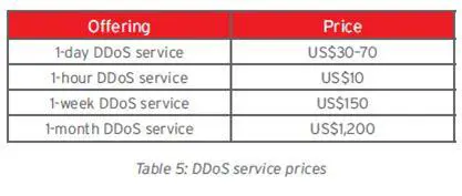 To arrange DDoS attacks, criminal need to use specially crafted bots and botnets. This means that he must obtain access to a huge quantity of machines and installs a daemon on it using his DDoS bot kit. In the following table are the reported costs for DDoS service renting and botnet renting, which is extremely cheap.