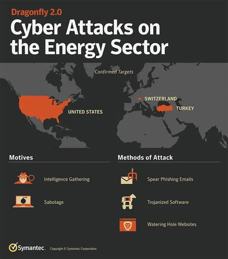 Dragonfly gang conducted a cyber espionage campaign against energy grid operators, major electricity generation firms, petroleum pipeline operators, and energy industry industrial equipment providers.