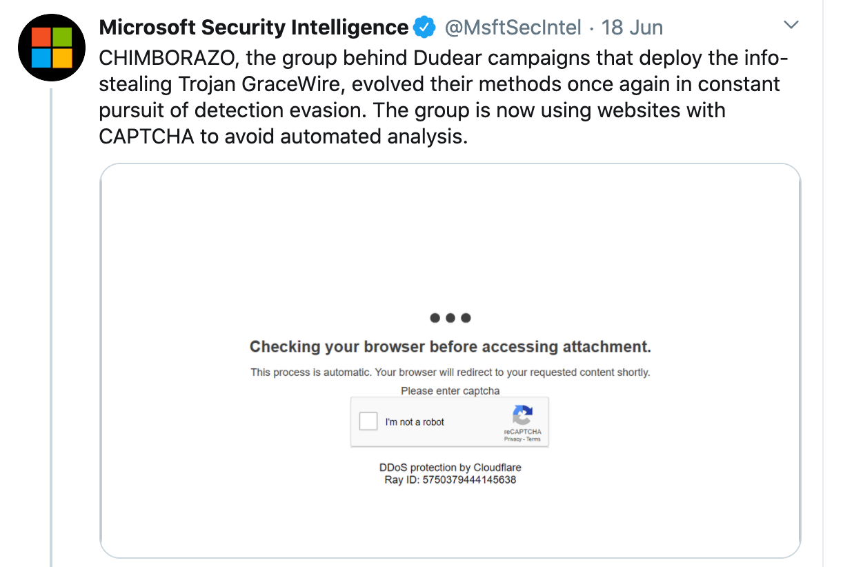 Microsoft said that the company has been tracking Chimborazo’s activities since January 2020. The group behind the Dudear campaigns involving info-stealing HTML redirectors are now using advanced methods to evade detection. Requiring users to complete CAPTCHA allows hackers to bypass automated analysis that security programs use to identify and block attacks.