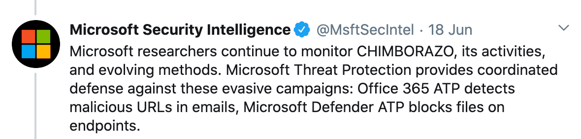 Microsoft also observed the way Chimborazo has been distributing Excel files. The group was initially distributing infected documents through attachments in phishing campaigns. Later, they were spreading it through embedded web links. The group then experimented with phishing messages featuring links that either led to redirector websites (aka compromised legitimate websites) or HTML attachments containing a malicious iframe tag.