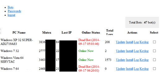 - At the moment the experts logged C2 servers, there were 50 bots active, 10 did not have a status, and 20 bots were "dead."